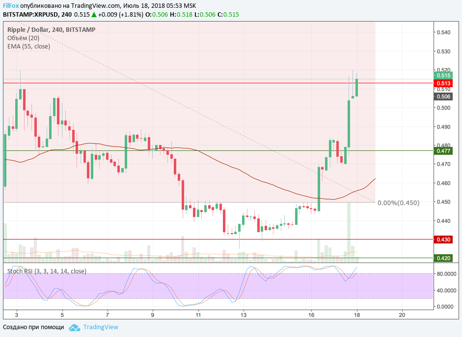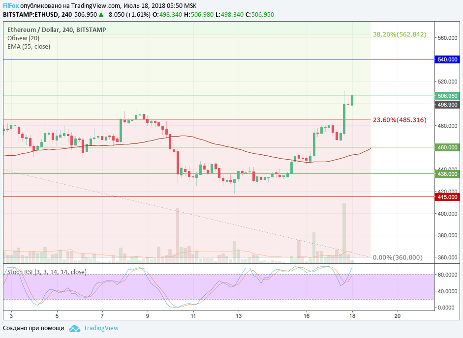 Ethereum вчера пробил уровень 23.6% фибо (485.31 USD) и получив от пары BTC/USD подтверждение восходящего тренда, довольно легко установил максимум в точке 511.00 USD. Когда объёмы торгов существенно сократились, пара откатилась к психологическому уровню 500 долларов за эфир и в этой области цена пролежала до утра. Сегодня утром был установлен новый максимум - 515.00 USD, и цена вновь ретировалась на психологический уровень.