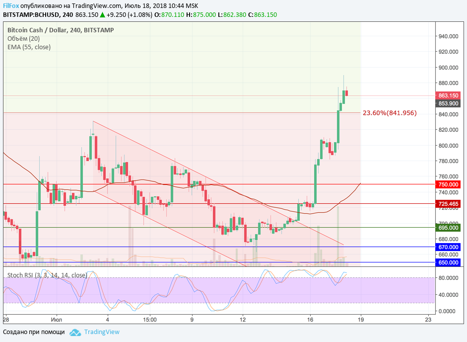 Вчера, в первой половине дня, пара консолидировалась в области 800 долларов. Рост пары BTC/USD потянул за собой рост Bitcoin Cash. От уровня консолидации, цена BCH пробила сопротивление 23.6% фибо (841.95 USD) и ночью установила максимум на отметке 858.00 USD. Сегодня утром максимум обновился, но стохастик показывает предстоящее снижение цены. Полагаем, что коррекция рынка достигнет поддержки 23.6% фибо (841.95 USD), а при дальнейшем отсутствии активности, цена может провалиться к уровню 811.00 USD.