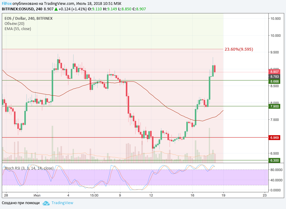 Как в синхронном плаванье, с парой BTC/USD активно росли все альткоины, и пара EOS/USD не была исключением. Ночью был установлен максимум на уровне 8.98 USD. Утром максимум обновился до отметки 9.35 USD. Сейчас, вместе со всеми альткоинами, EOS перешел в фазу коррекции. Откат может продолжиться к уровню поддержки 8.666 USD. После этого ожидается возобновление роста к целевому уровню 23.6% фибо (9.595 USD). Если объёмы торгов будут ниже средних, то коррекция затянется глубже, тогда уровень 8.08 USD должен остановить дальнейшее снижение цены.