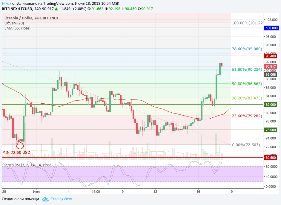 Вчера, после отката ниже уровня сопротивления 82.00 USD, цена в первой половине дня постепенно восстановилась к уровню 38.2% фибоначчи (83.47 USD). После того, как был получен сигнал, подтверждающий восходящий тренд по паре BTC/USD, Litecoin моментально отреагировал стремительным ростом к целевому уровню 61.8% фибо (90.25 USD). На подходе к этому уровню сопротивления, объёмы покупок сократились и цена до утра зависла в консолидации.