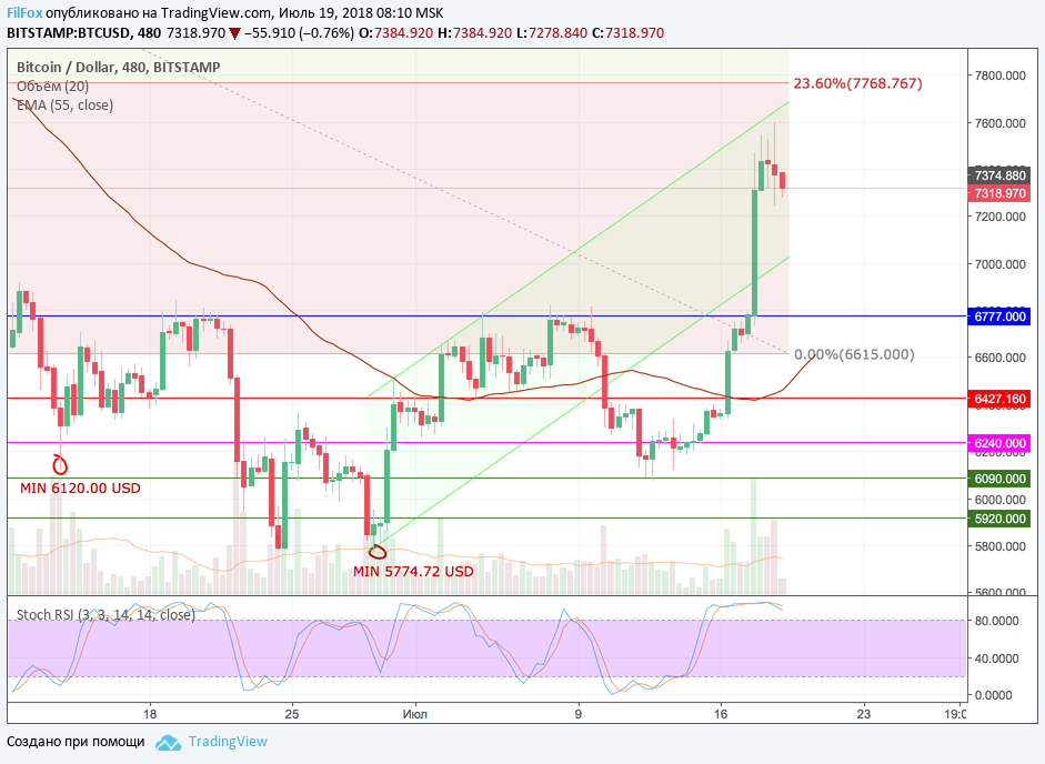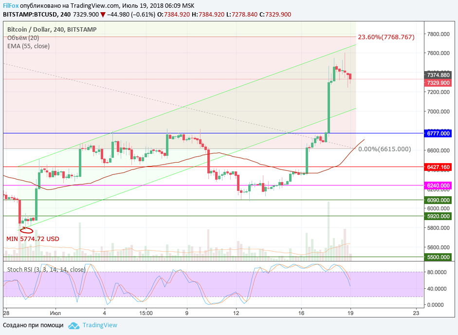 Вчера после максимума на уровне 7600.00 USD, цена Bitcoin перешла в коррекцию и начала откатываться к уровню 7200.00 USD. Однако по паре BTC/USD снижение было не таким глубоким, как у остальных альткоинов, которые просели почти к своему начальному уровню, от которого начинался бычий импульс.