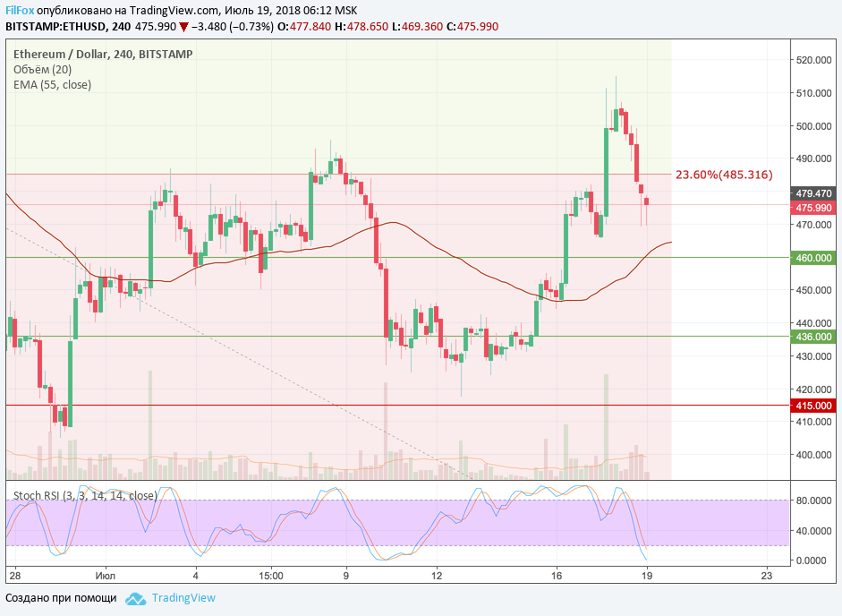 Во вторник вечером взрывной рост пары ETH/USD начинался от уровня 470.00 USD и достиг максимума вчера утром на отметке 515.00 USD. В течении вчерашнего дня цена откатилась к уровню 23.6% фибоначчи (485.31 USD), но этот уровень не смог оказать паре достойную поддержку и цена продолжила коррекцию, уходя ещё глубже. В завершении дня пара протестировала стартовый уровень 470.00 USD и сделала первую робкую попытку восстановиться. Попытка оказалась не совсем удачной, потому что покупки не получили поддержки объёмами, и сегодня утром пара вновь тестировала исходный уровень 470.00 USD. На данный момент цена подвисла в области 475.00 долларов за эфир и в отсутствии объёмов и покупателей и продавцов, готова идти в любую сторону, в которую начнут продавливать.
