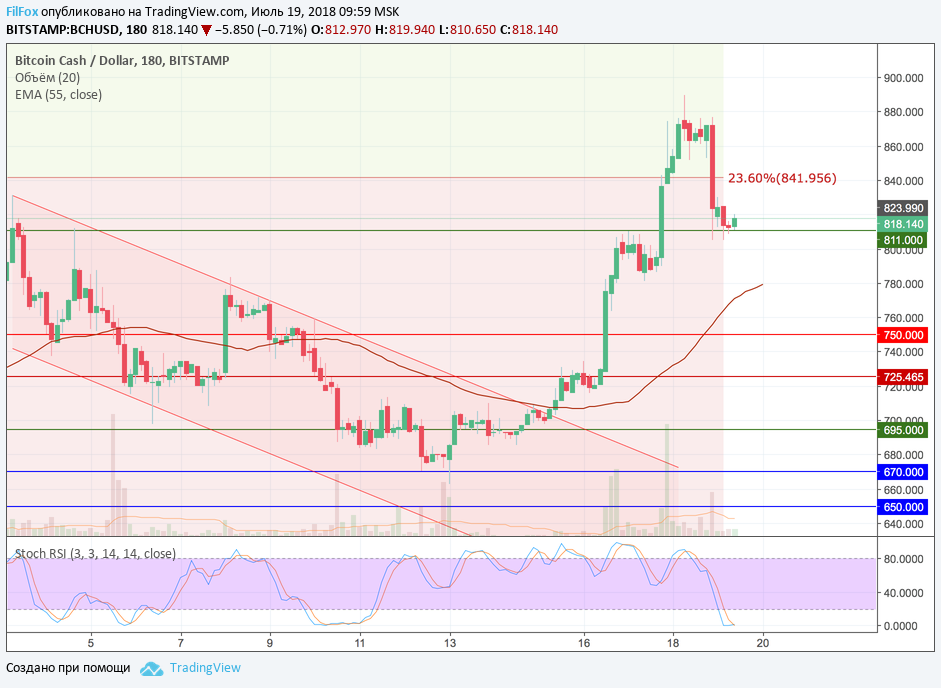 Вчерашняя коррекция пробила уровень поддержки 23.6% фибо (841.95 USD). Цена не смогла зацепиться за эту поддержку и при дальнейшем откате установила минимум в точке 805.00 USD. Сегодня Bitcoin Cash пробует консолидироваться вдоль уровня 811.00 USD, постепенно сужая диаппазон консолидации к этой зелёной линии. На трехчасовом и четырёхчасовом графике стохастик в зоне перепроданности формирует сигнал на рост. Возможно, что именно от этого уровня покупатели смогут активизироваться и цена восстановиться к уровню 23.6% фибоначчи (841.95 USD).
