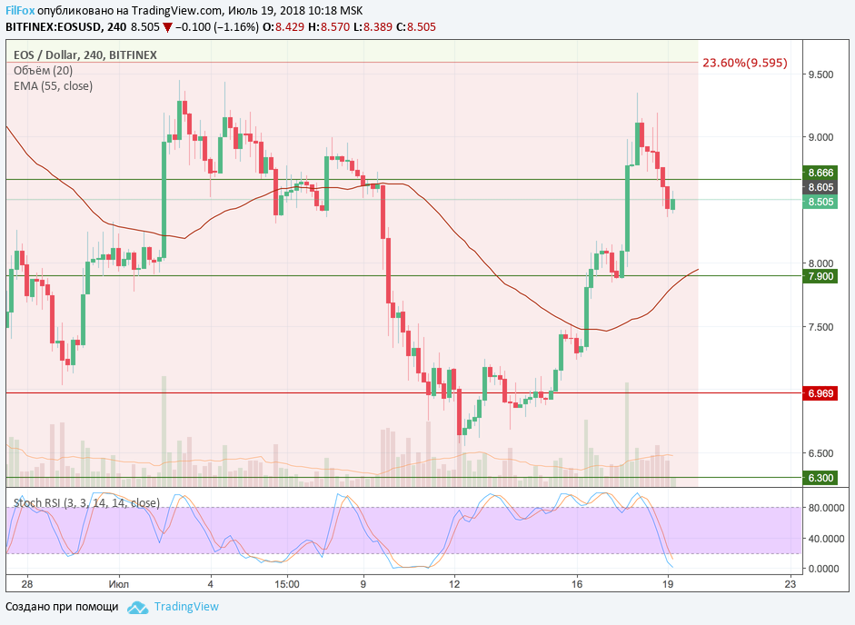 Коррекция EOS не остановилась на уровне 8.666 USD. Полагаем, что точкой минимума может являться отметка 8.36 USD. Похоже, что от этого уровня цена перешла в консолидацию и, при поддержке покупателей, способна продолжить восстановление к уровню 8.666 USD.