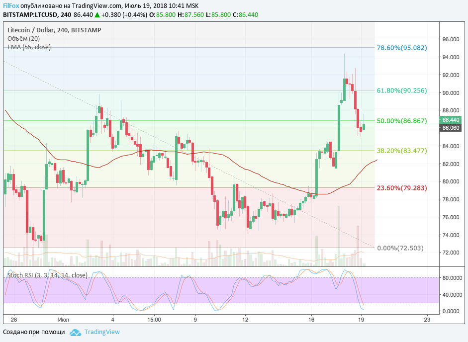Вчера объёмы торгов по паре LTC/USD были ниже средних и поэтому коррекция затянулась, как мы и предполагали, до уровня 85 долларов за лайт. Цена установила минимум на отметке 84.98 USD и смогла восстановиться к 50% фибо (86.86 USD). Полагаем, что в этом диапазоне сегодня продолжится консолидация. Вполне возможно, что диапазон консолидации будет расширяться, так как это характерно для рынка, который не определился с дальнейшим направлением тренда.