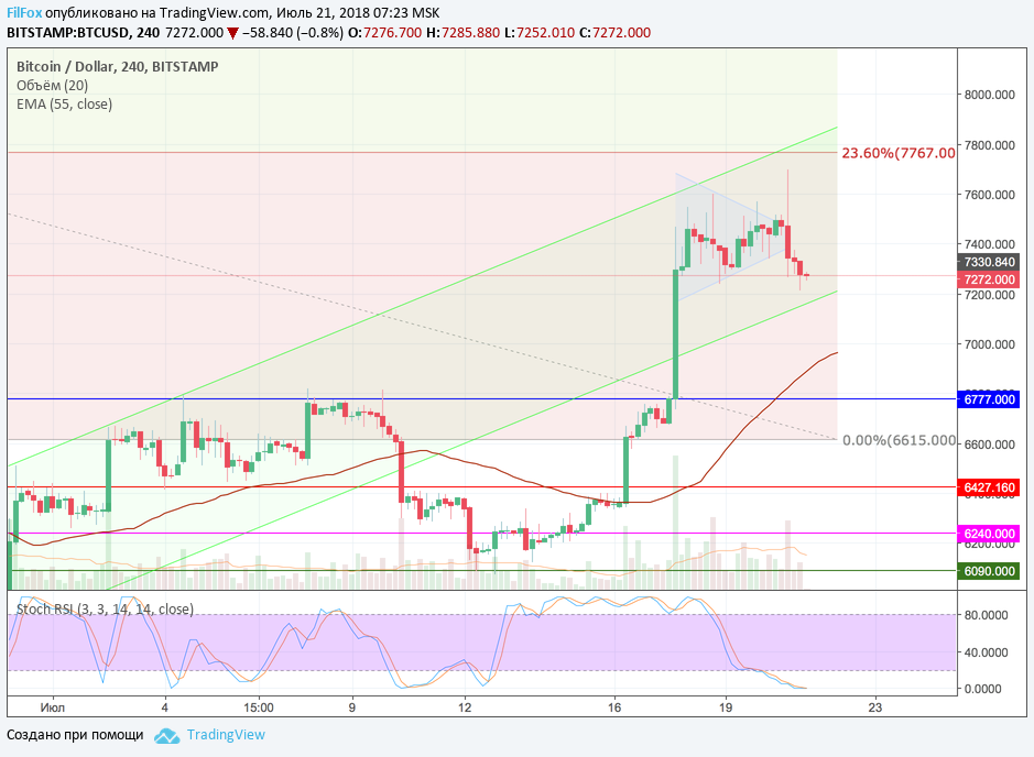 Вчера цена Bitcoin продолжительное время консолидировалась в сужающемся диапазоне. Интригой дня до последнего момента оставалось направление, в котором цена должна была выйти из треугольника. По классике жанра технического анализа, пара должна была пробить верхнюю границу треугольника и продолжить восходящий тренд. Но стохастик указывал на предстоящее снижение пары. И вот, когда, испытывая нервы участников рынка, цена сузила диапазон на верхней границе треугольника, наконец-то появился импульс движения по восходящему тренду. В момент фиксации максимума на отметке 7696.00 USD многие уже начали догадываться, что пробой был ложный.