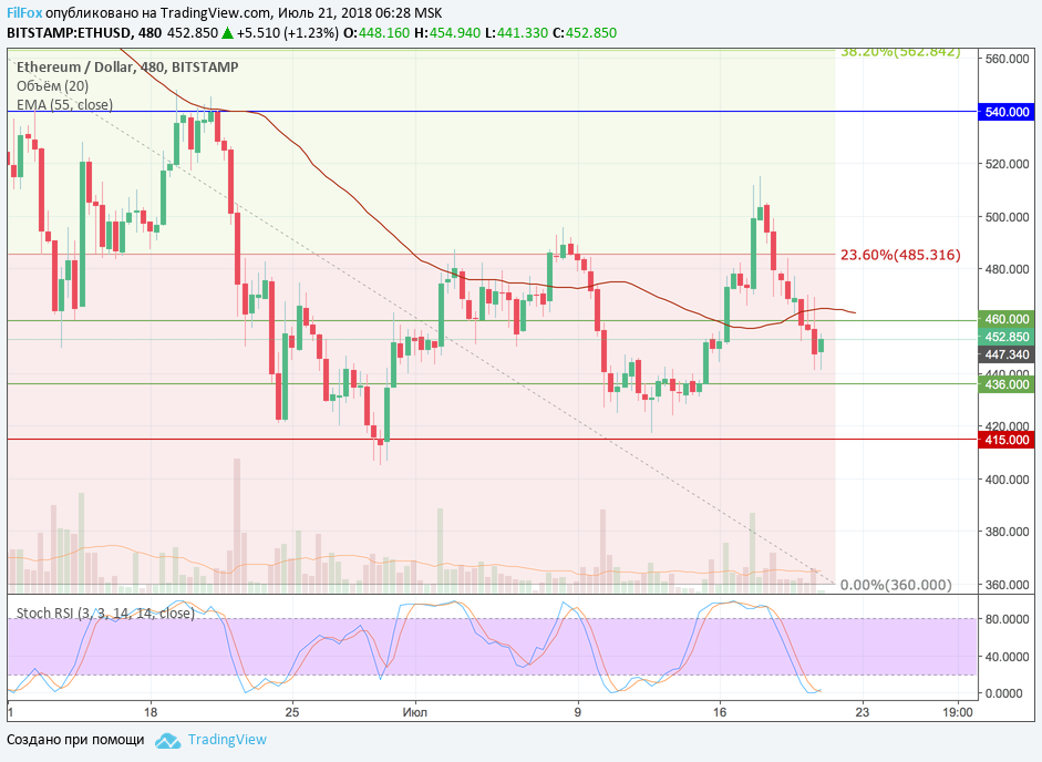 Вчера Ethereum после продолжительной консолидации на уровне поддержки 460.00 USD, провалился в коридор между двумя зелёными линиями 460.00 USD - 436.00 USD. Первые попытки выпрыгнуть из него, только усугубили положение пары и цена увязла на минимуме 441.00 USD. После очередного ре-теста минимального уровня, индикатор стохастика подтвердил намерения выбраться за пределы коридора.