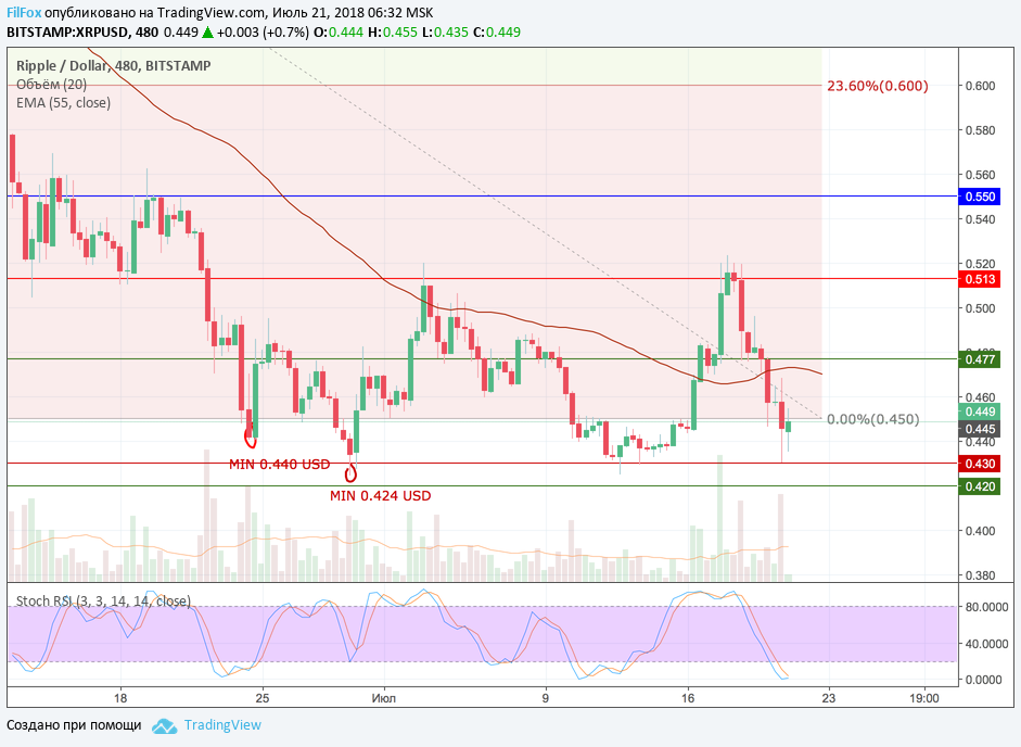 Вчера на снижении пара XRP/USD пробила поддержку нулевого уровня фибоначи 0.450 USD, а остановить падение удалось только на поддержке 0.430 USD, где было зафиксировано минимальное дневное значение пары. За ночь цена смогла неплохо восстановиться к сопротивлению 0% фибо (0.450 USD) и сейчас она консолидируется над этим уровнем. После непродолжительного флэта ожидаем возобновление роста к уровню 0.477 USD.