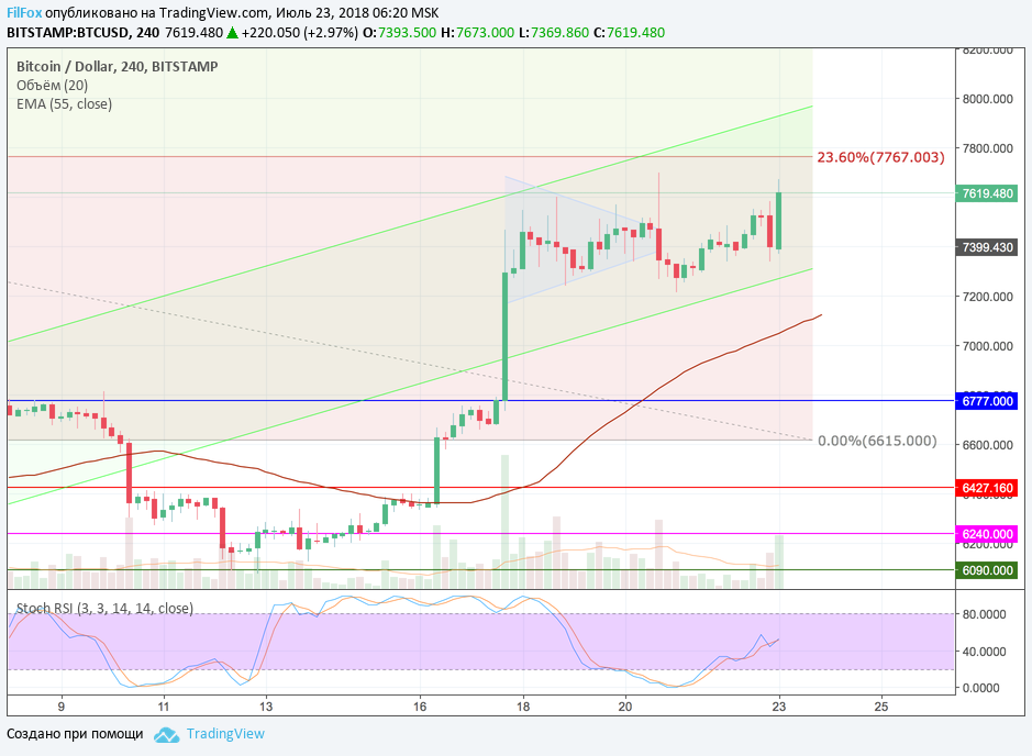 На выходных Bitcoin консолидировался, опираясь на поддержку в области 7400.00 USD. На восьмичасовом тайм-фрэйме стохастик сформировал сигнал на рост. Сегодня предполагаем, что цена коснется сопротивления уровня 23.6% фибо (7767.00 USD).