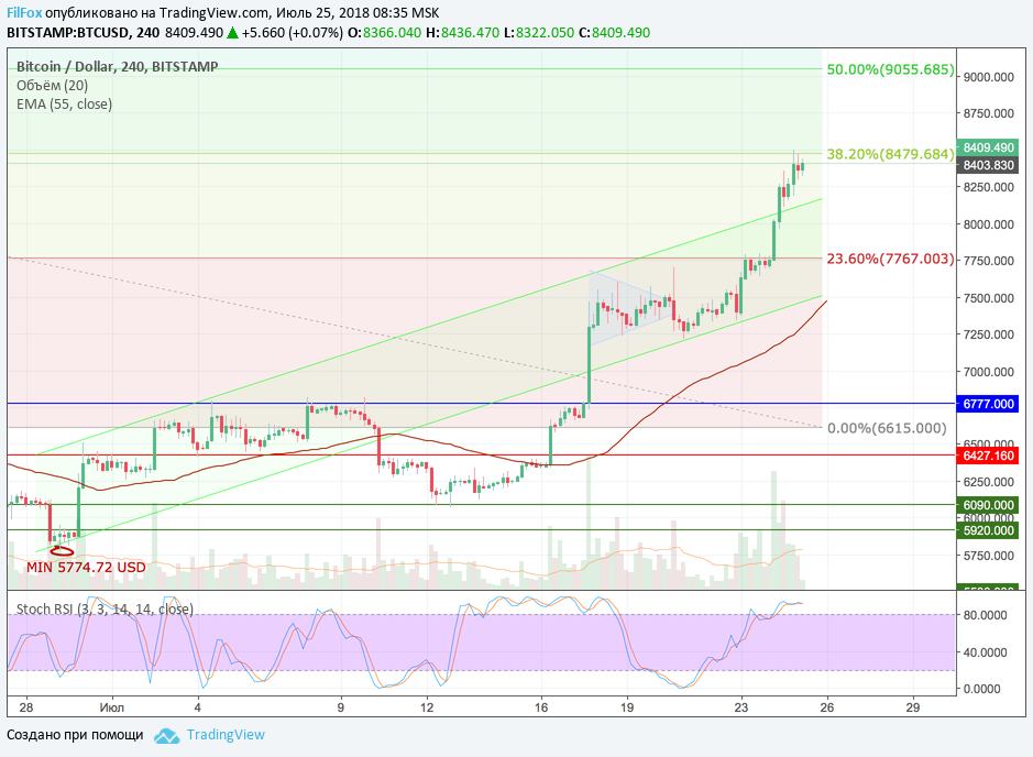 Сегодня, на малых объёмах, цена протестировала сопротивление на уровне 38.2% фибо (8479.68 USD). Если объемы торгов увеличатся до вчерашнего уровня, то возможно нас ожидает рост в область 50% фибо (9055.00 USD). Однако на восьмичасовом тайм-фрейме стохастик находится в зоне перекупленности и формирует сигнал на снижение. Велика вероятность, что сопротивление приостановит рост пары и развернёт цену в коррекцию. При этом откат будет, не такой глубокий, как мы вчера предполагали, и ограничится областью восемь тысяч долларов.