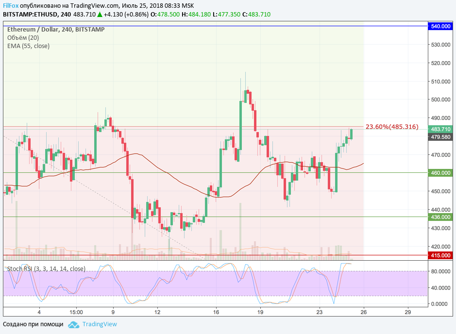Ethereum вчера вышел за пределы бокового коридора, пробив его верхнюю границу 460.00 USD и установил максимум на отметке 483.24 USD. Ночью цена немного продолжила рост, но уже на меньших объёмах, пытаясь протестировать уровень 23.6% фибоначчи (485.31 USD). Стохастик в зоне перекупленности сейчас формирует сигнал на снижение и возможно сегодня сопротивление 23.6% фибо развернёт цену на снижение, в область 468.00 долларов за эфир.