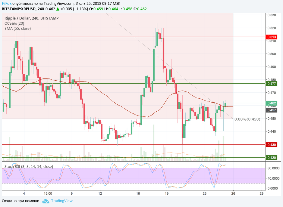 Вчера пара развернулась на минимуме в точке 0.437 USD и смогла восстановиться до уровня цен начала недели, в область поддержки EMA55. Установив дневной максимум на отметке 0.469 USD, Ripple откатился к уровню средних цен, пытаясь консолидироваться в этой области.