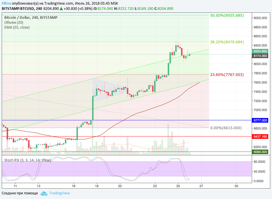 После того, как был сформирован дневной минимум в точке 8049.22 USD, пара попыталась продолжить рост, но выйти за пределы верхней границы коридора роста пока не получилось. На четырёхчасовом тайм-фрейме стохастик сформировал сигнал на покупки, но объёмы торгов намного ниже средних, поэтому организовать полноценный рост пока не удаётся. Прорыв выше трендовой линии даст возможность закрепиться над уровнем 38.2% фибоначчи.