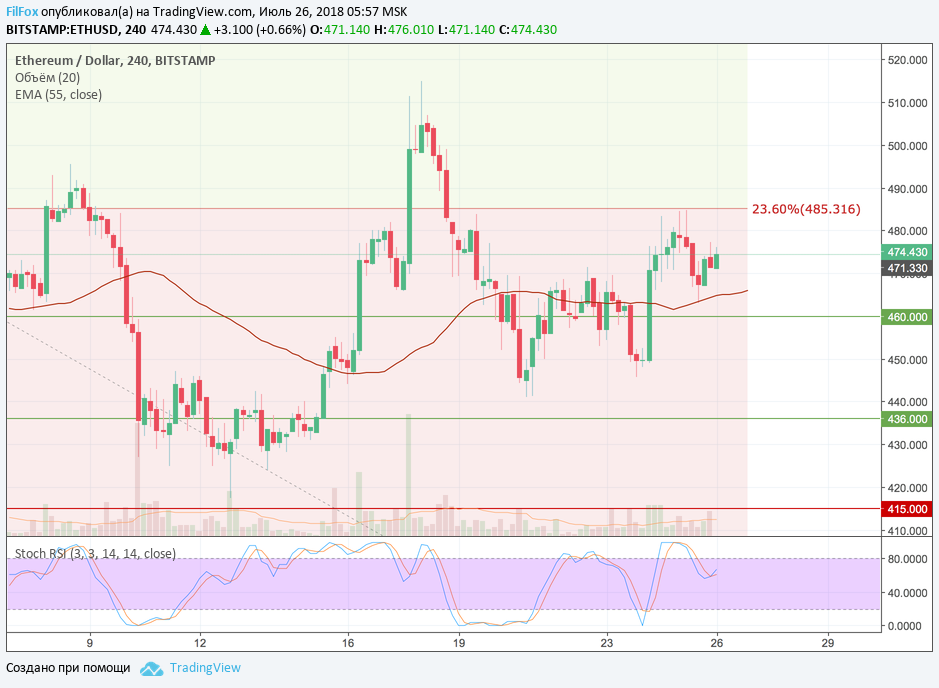 Полагаем, в течение дня, цена Ethereum будет находиться в боковом диапазоне между этим сопротивлением и скользящей средней EMA55 (466.00 USD).