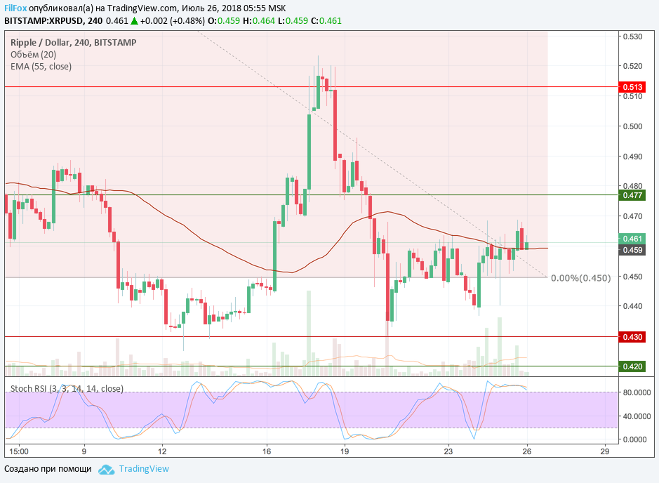 Вчера Ripple весь день находился в боковике относительно скользящей средней EMA55. С утра она выступала как сопротивление, а во второй половине дня - не давала цене просесть ниже уровня 0.460 USD. Сегодня колебания во флэте продолжатся, причем амплитуда отклонения от равновесного состояния может увеличиваться в обе стороны от уровня средних цен. Нулевой уровень фибоначчи (0.450 USD) будет ограничивать амплитуду при снижении.