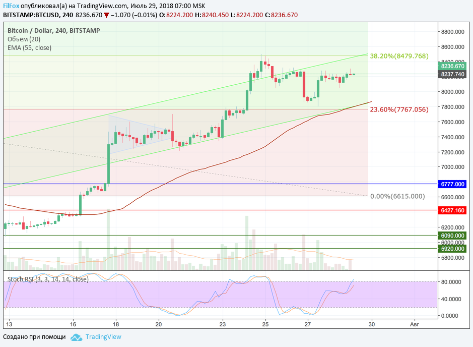 Следующий шаг был сделан комиссаром SEC, который обвинил своё ведомство в поспешности принятия решения по этому вопросу. Кроме этого крупнейшая фондовая биржа Nasdaq провела закрытую встречу среди заинтересованных крупных участников крипторынка и традиционного фондового мира по вопросу укрепления репутации криптоактивов на финансовом рынке. Эти фундаментальные новости положительно отразились на настроении крипто-инвесторов и цена пары BTC/USD смогла полностью восстановиться до прежнего уровня 8230.00 USD.