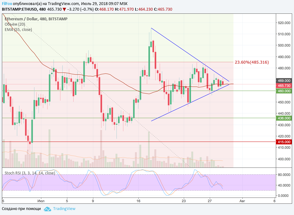 На выходных Ethereum консолидируется в сужающемся диапазоне возле скользящей средней EMA55, образуя паттерн вымпел. Полагаем, что выходом из сужающегося диапазона будет бычий пробой уровня сопротивления 23.6% фибо (485.31 USD) и рост в целевую зону 520.00 USD.