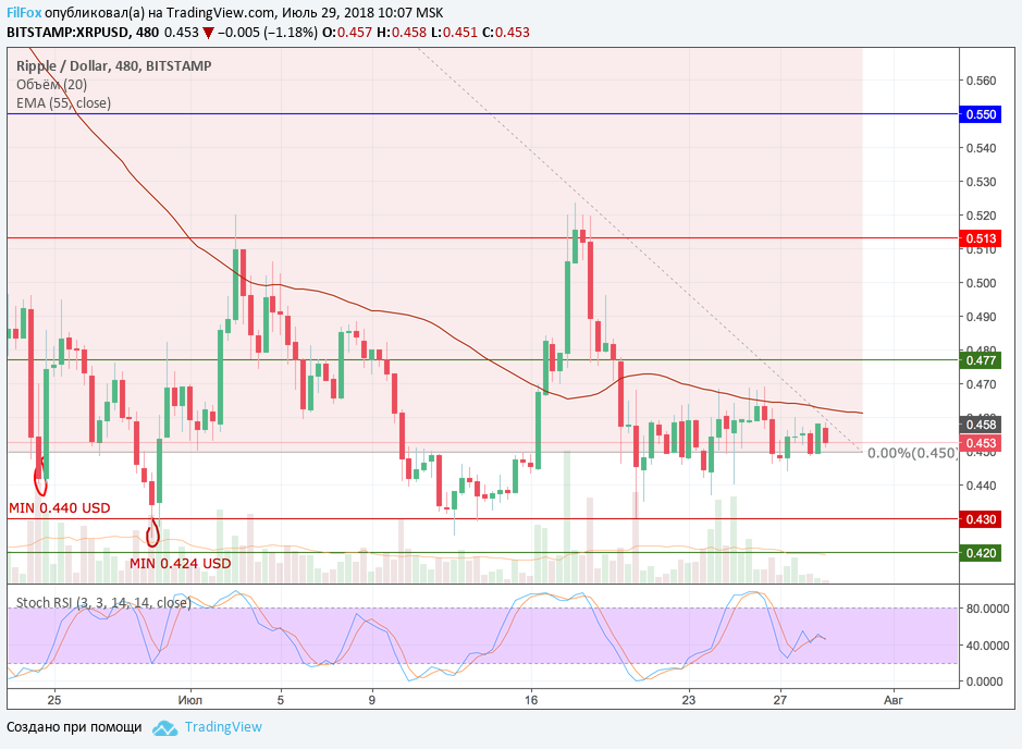 Ripple ещё на прошлых выходных зашел в боковой коридор, нижняя граница которого в виде нулевого уровня фибоначчи (0.450 USD), удерживала цену от снижения. Однако во вторник пара всё-таки провалилась ненадолго к минимуму 0.437 USD и от этого уровня активно выкупалась очень большими объёмами. Достигнув уровня средних цен, объёмы покупок сократились и пара до сих продолжает флет между скользящей средней EMA55 (0.464 USD) и 0% фибо (0.450 USD). Выход из боковика к уровню 0.477 USD пока затягивается до подтверждения роста криптовалютного флагмана BTC/USD, связь с которым, кстати, на этой неделе была почти потеряна.