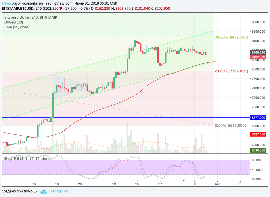 Вчера, во второй половине дня, цена Bitcoin откатилась к нижней границе зелёного коридора. Стремительно снижаясь, цена проколола нижнюю трендовую линию коридора, установив минимум в точке 7853.00 USD. Однако скользящая средняя EMA55 смогла развернуть пару и цена уже не так динамично, как снижалась, смогла восстановиться на прежний уровень 8150.00 USD. Возможно резкий скачок цены был вызван информацией из Южной Кореи. Ранее, правительством Южной Кореи, заявлялось о намерении развития финтех отрасли и технологии блокчейн.