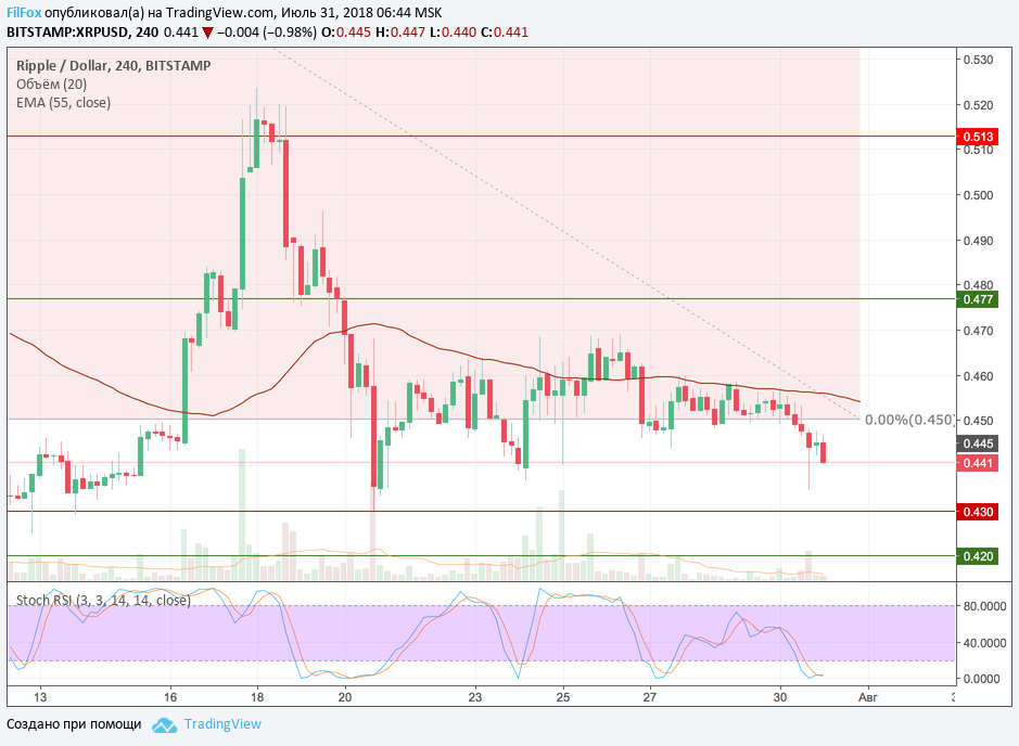Ripple вчера вышел из боковика, пробив поддержку нулевого уровня фибоначчи и установил дневной минимум в точке 0.435 USD. Cегодня цена хоть и смогла восстановиться к уроню 0.440 USD, но похоже, что снижение ещё не завершилось. Восстановление к 0% фибо (0.450 USD) может начаться после формирование сигнала стохастика на покупки, когда цена достигнет поддержки 0.430 USD.