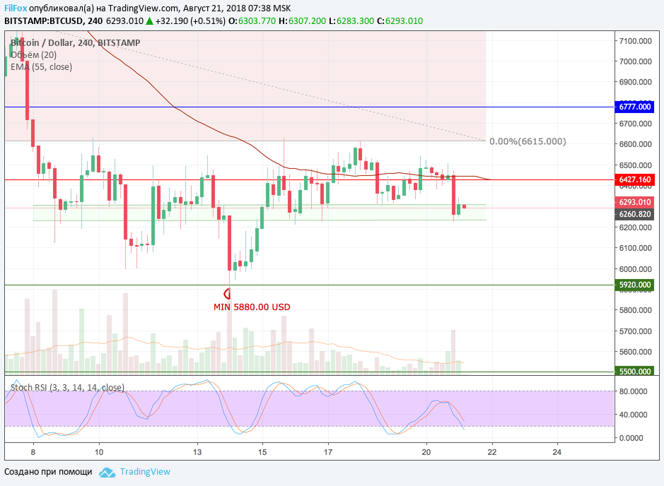 Вчера от уровня скользящей средней EMA55, цена просела к зелёной области поддержки $6300-$6233. Нижняя граница этой области вернула пару в боковой диапазон, который начался с 8 августа и до сих пор испытывает терпение покупателей и продавцов. Прорыв границы данного диапазона может быть как в продолжение нисходящего тренда с обновлением годового минимума, так и против тренда, в продолжение начавшегося восстановления от минимума 5880.00 USD.