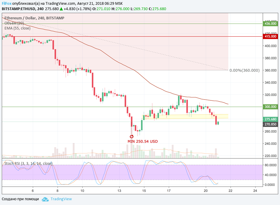 Ethereum вчера пробил желтую область поддержки и теперь довольно высока вероятность обновления годового минимума. Однако, если предположить, что двухнедельный боковик пары BTC/USD будет продолжаться, то и цена эфира может восстановиться к сопротивлению 300.00 USD и возобновить движение во флэте.