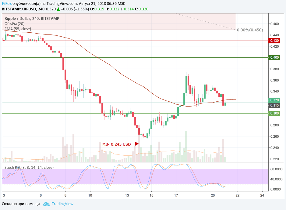 Ripple вчера отклонился от узкого диапазона на уровне 0.342 USD и соскользнул ниже уровня средних цен. Однако это ещё нельзя назвать бычьим импульсом, который выведет цену из боковика. Сегодня пара восстановится на прежний уровень, выше скользящей средней EMA55 и продолжит боковое движение.