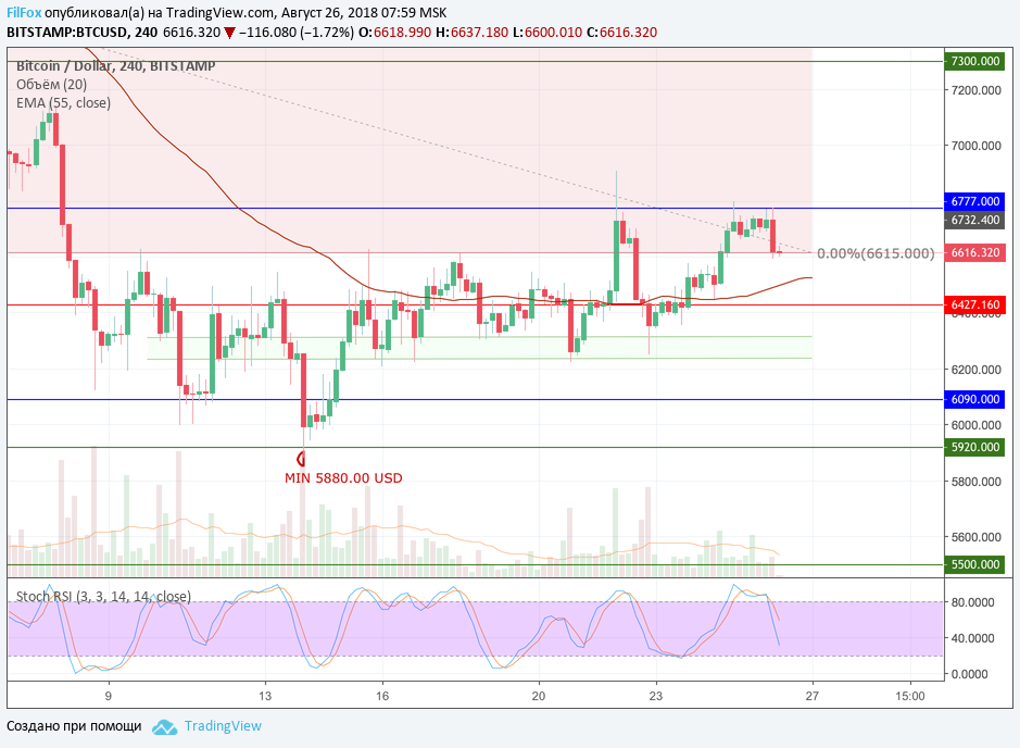 Последующее заявление Комиссии по ценным бумагам и биржам (SEC), о возможном пересмотре своего решения по ETF-заявкам, немного ослабило негатив информационного поля и пара BTC/USD уже несколько раз смогла протестировать сопротивление 6777.00 USD, но преодолеть этот уровень на снижающихся объёмах пока не получается. Сегодня ночью, после очередного неудачного прорыва, цена откатилась к нулевому уровню фибоначчи 6615.00 USD.