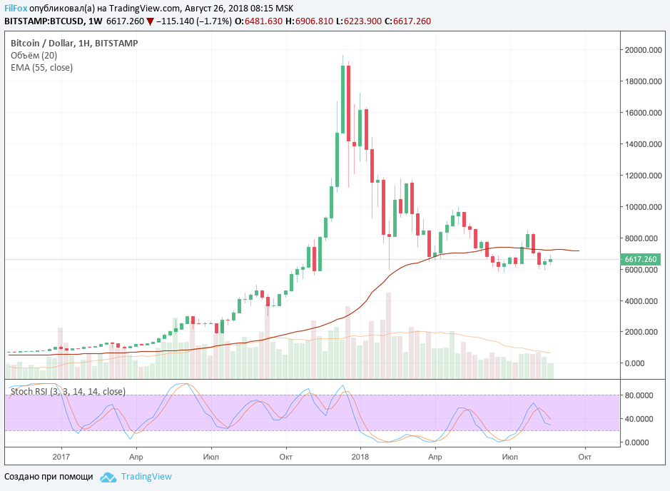 Эта неделя была подвержена ажиотажу вокруг решения SEC по ETF-заявкам. По мнению большинства аналитиков, событие должно было послужить драйвером для выхода рынка из продолжающегося с 8 августа бокового коридора. Однако учитывая печальную статистику по отказам SEC, рынок был уже готов к фундаментальному негативу и поздно вечером, 22 августа, отреагировал снижением в пределах коридора флэта. Накануне курс Bitcoin пытались пампить и цена прорвав верхнюю границу диапазона, установила максимум на отметке 6906.00 USD. Очень быстро пара вернулась на прежний уровень 6427.16 USD, а потом уже просела в зелёную зону поддержки на новостях по ETF.
