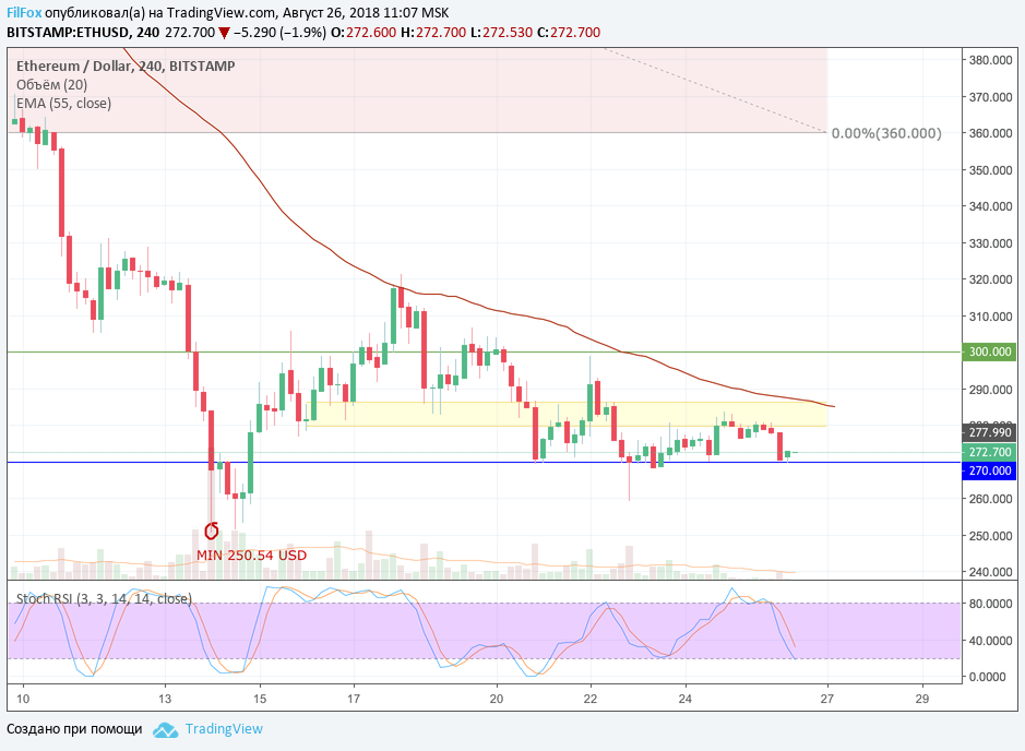 Всю неделю Ethereum провёл в боковике, опираясь на поддержку уровня 270.00 USD. В среду, 22 августа, поддавшись на провокацию ложного прорыва пары BTC/USD, эфир смог добежать до верхней границы диапазона 300.00 USD, но потом вновь вернулся в узкий диапазон между нижней границей 270.00 USD и желтой областью сопротивления.