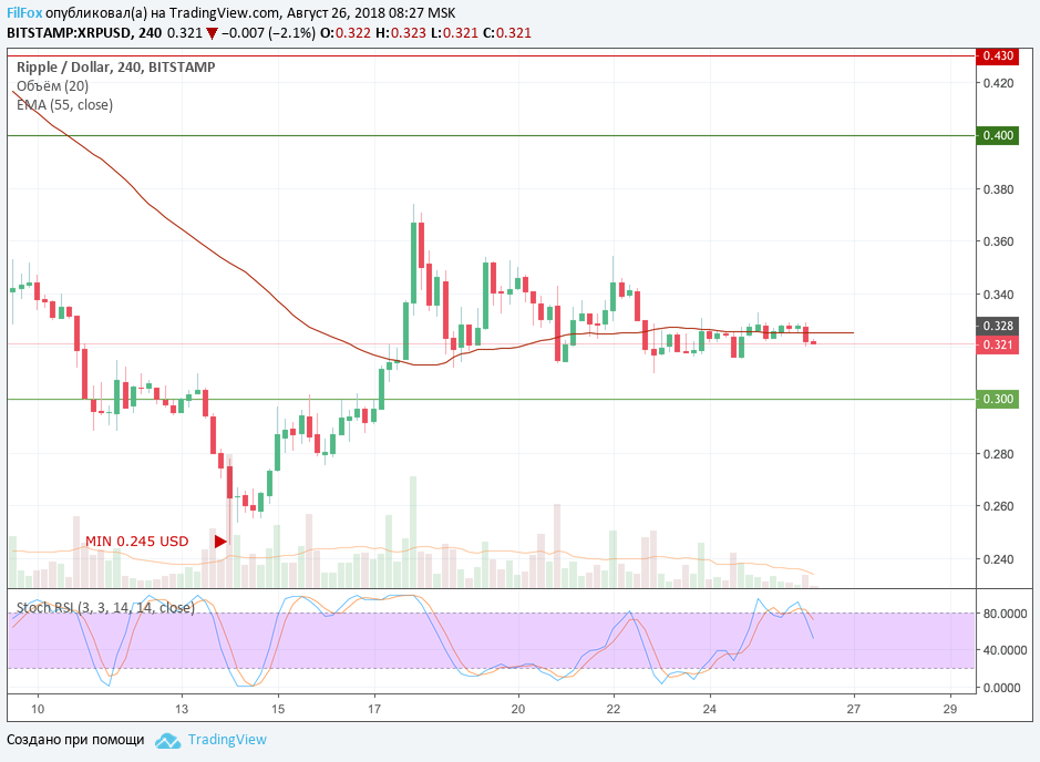 Ripple старался не поддаваться на провокации пампа и негатива фундаментальных событий, поэтому всю неделю старательно сужал боковой диапазон вдоль скользящей средней EMA55. Похоже, что пара готовится какому-то сильному импульсу по выходу из диапазона консолидации. Основные уровни предстоящего импульсы мы определяли как сопротивление на уровне 0.430 USD и поддержка в области очередного годового минимума 0.233 USD.