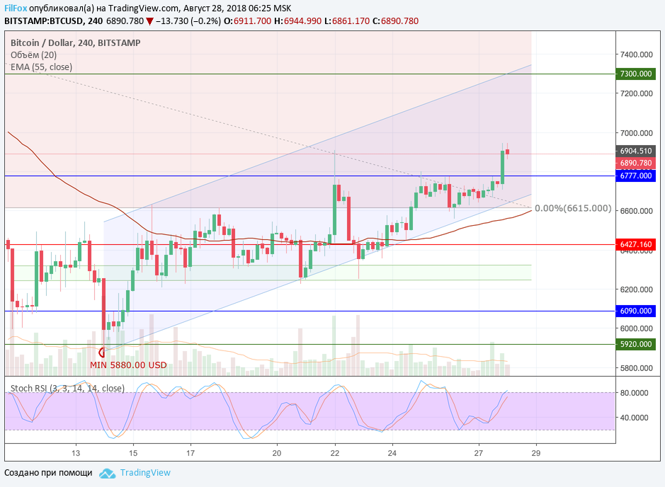 Вчерашний день закрылся котировками в районе 6720.00 USD, а сегодня ночью общими усилиями американской сессии удалось пробить верхнюю границу бокового диапазона на отметке 6777.00 USD и установить первый локальный максимум 6945.00 USD. Полагаем, что глубоких откатов не будет и в течение дня цена сможет достигнуть промежуточный уровень 7200.00 USD.