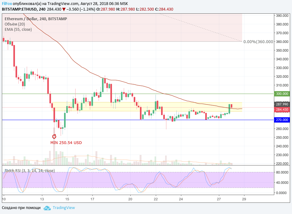 Прорыв BTC за пределы боковика не воодушевил остальные альткоины на импульс такой же силы. Довольно вялая реакция на бычий импульс криптовалютного флагмана наблюдается на графике Ethereum. Цена эфира пробила уровень средних цен и закрепилась в желтой области сопротивления. Но пределы бокового коридора, который длится уже третью неделю, пара ETH/USD пока не покинула. Сегодня, в течение дня, возможен ре-тест верхней границы коридора 300.00 USD и прорыв в область цен 320 долларов за эфир.