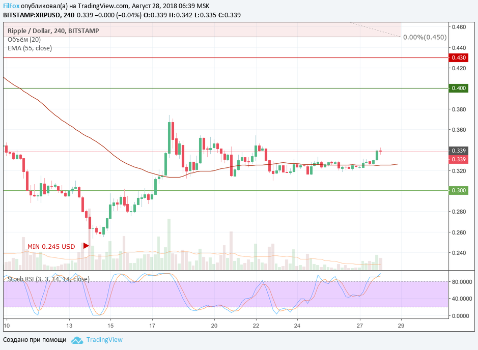 Сейчас стохастик находится в зоне перекупленности, а пара до сих пор - в пределах коридора. Однако XRP уже готов последовать за BTC, если бычьи импульсы на графике биткоина будут подкреплены крупными объёмами. Подтверждением серьёзных намерений Ripple вырваться из флэта будет установление нового максимума в области 0.380 USD. Продолжением такого сценария будет прорыв уровня 0.400 USD c последующим максимумом в области 0.430 USD.