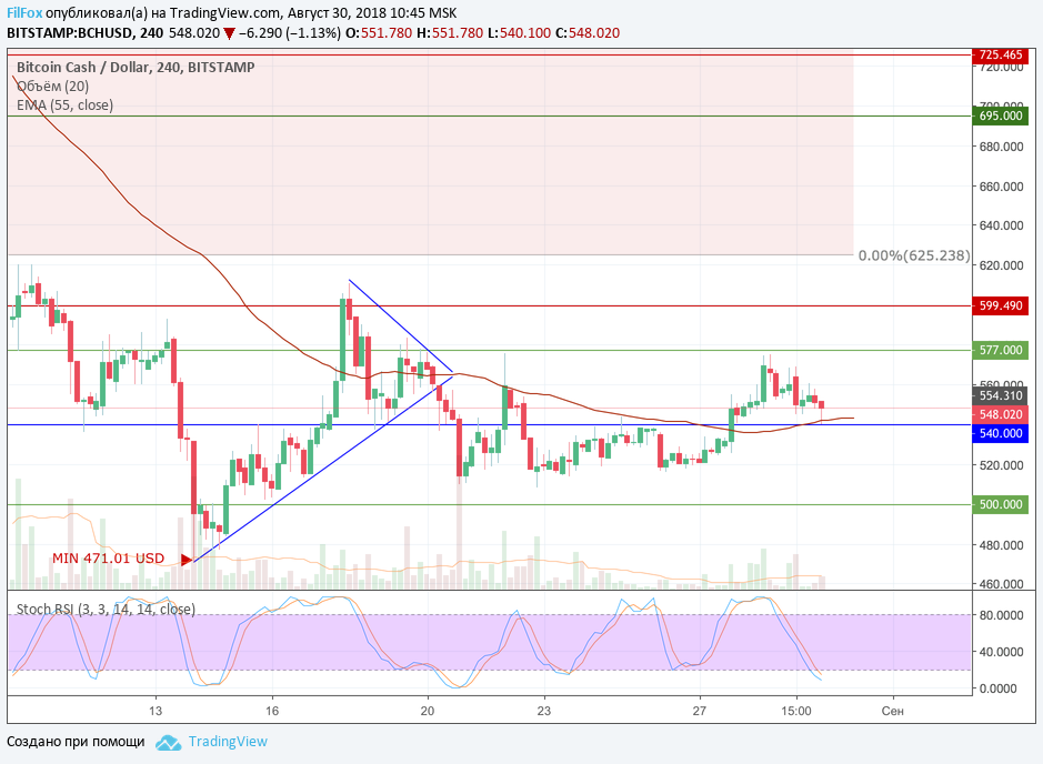 Вчера Bitcoin Cash отказался пробивать сопротивление 577.00 USD и консолидировался в области 553 доллара за монету. Сегодня цена откатилась ещё ниже и протестировала поддержку 540.00 USD. Полагаем, что после кратковременной консолидации цена в области средних цен получит поддержку от скользящей средней и вновь повторит попытку пробить сопротивление 577.00 USD.