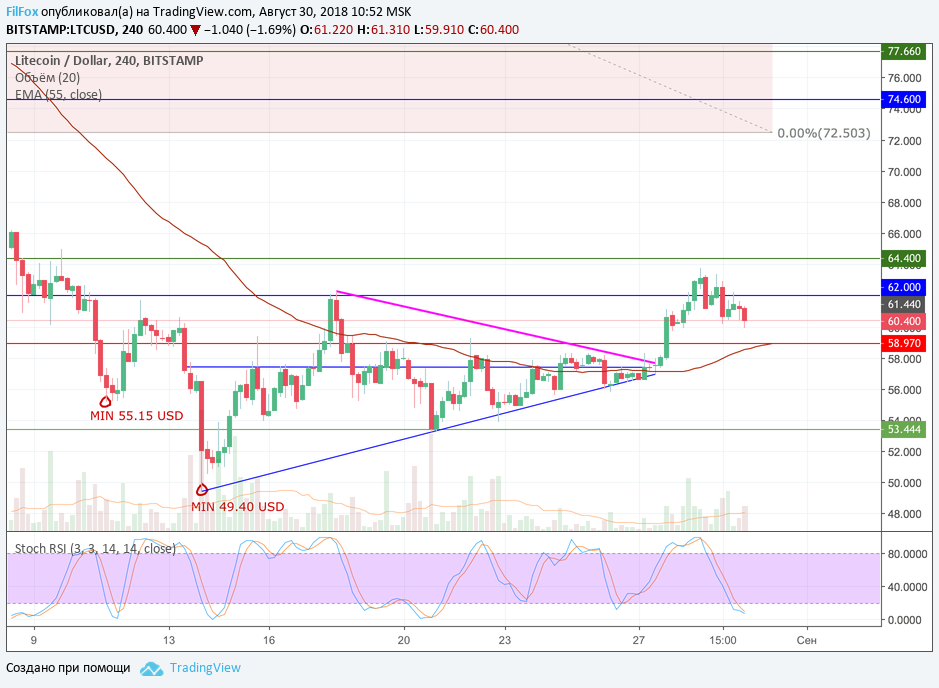 Litecoin в пределах своего бокового диапазона демонстрирует понижающиеся максимумы и минимумы. Однако снижение цены происходит настолько плавно, что пара не успела вчера откатится к поддержке 58.97 USD. Сегодня на этом уровне проходит скользящая средняя, которая может поддержать цену LTC и дать ещё один шанс паре закрепиться выше сопротивления 62.00 USD.
