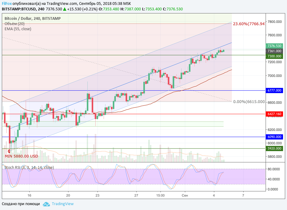 Вчера крупные объёмы покупок продавливали цену Bitcoin сквозь сопротивление 7300.00 USD. Достигнуть уровень средней линии восходящего канала не получилось, но засветиться на максимуме 7411.00 USD - удалось. Правда не надолго. Сразу после максимума цена откатилась к уровню 7300.00 USD, но до завершения дня цене удалось закрепиться над этим уровнем, который выполнил роль поддержки.