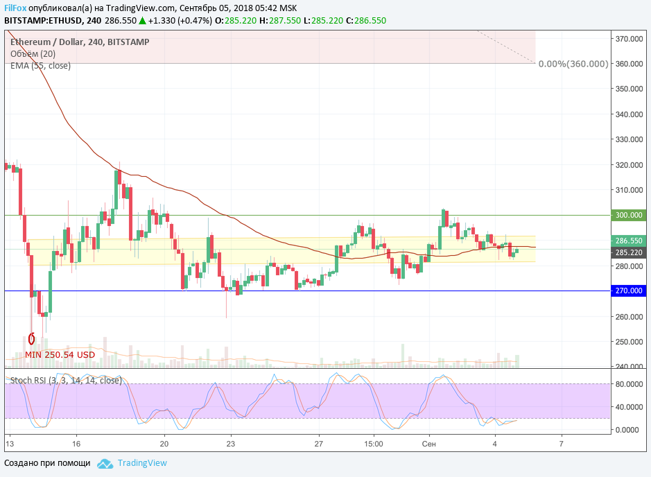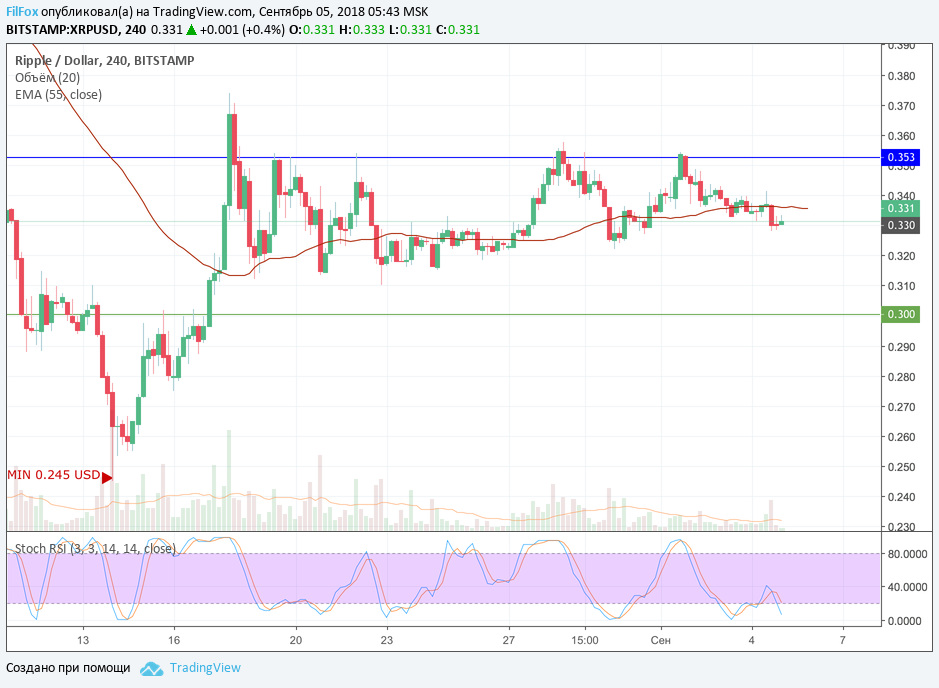Цена Ripple вчера упала ниже уровня средних цен, но очень старалась не опускаться ниже отметки 0.328 USD. Сегодня ночью небольшие объёмы покупок пытались возвратить цену к уровню скользящей средней EMA55. Ожидаем, что в этой области цена продолжит сегодняшнюю консолидацию.