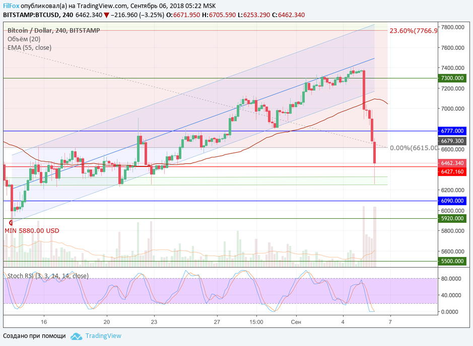 Вчерашняя консолидация цены под средней линией восходящего канала закончилась глубоким падением пары. За вторую половину суток пара нивелировала рост, который был достигнут за две недели восхождения в фиолетовом коридоре. Остановить падение смогла только зелёная область поддержки на уровне 6250.00 USD. В этой зоне Bitcoin начали активно выкупать и цена восстановилась к первоапрельскому минимуму до отметки 6427.16 USD.