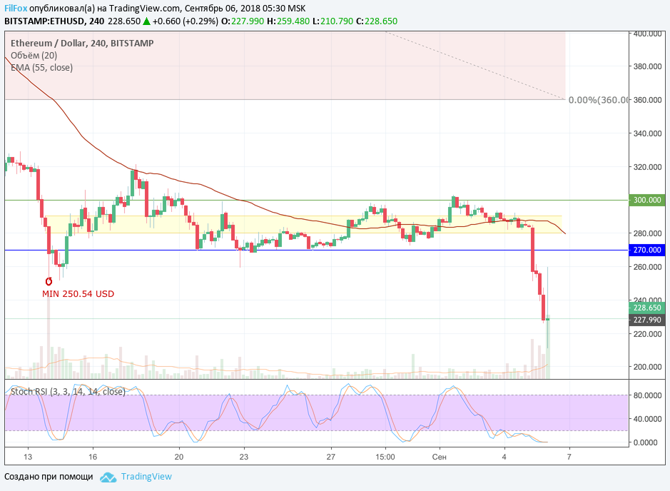 Вчера консолидация в желтом коридоре закончилась, и цена Ethereum пробила нижнюю границу бокового диапазона, в котором находилась пять недель. За короткое время стремительного падения Ethereum успел обновить годовой минимум, установленный 14 августа до уровня 210.79 USD.