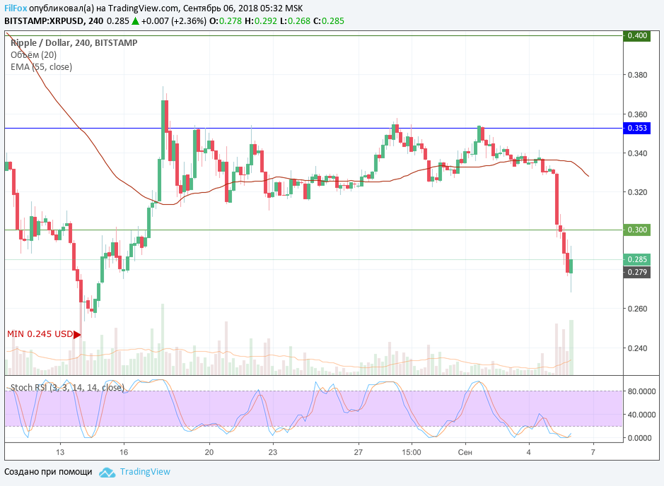 По сравнению с BTC и ETH, Ripple вчера снижался более инертно. Добравшись до нижней границы бокового диапазона на уровне 0.300 USD, цена сначала вернулась в пределы диапазона. Но медвежье давление на всём рынке было настолько сильное, что со второго раза цена прорвала нижнюю границу пятинедельного боковика и установила минимум на отметке 0.268 USD. И хотя снижение цены было весьма значительное, обновить годовой минимум, установленный 14 августа на отметке 0.245 USD пока не удалось.