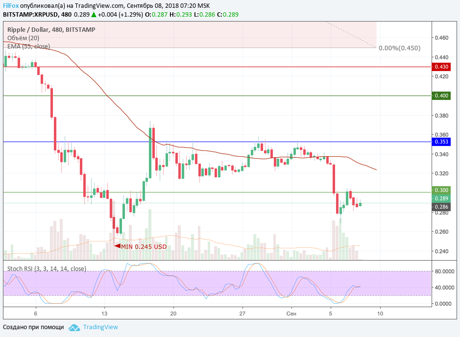 Вчера цена Ripple долго не смогла удержаться на нижней границе боковика и опустилась в область 280.00 USD. Стохастик застрял в нейтральной зоне, что указывает на переход пары в боковой диапазон. Полагаем, что сегодня после ре-теста сопротивления на уровне 300.00 USD, может возобновиться снижение в область 0.26 USD.