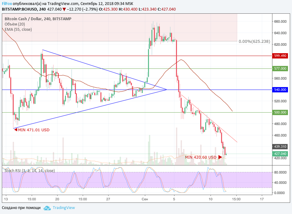 Bitcoin Cash вчера в течение всего дня опускался вниз. Цена BCH, проскочив область 450.00 USD, зафиксировала минимум на отметке 425.00 USD. Сегодня снижение пары не останавливается и цена успела протестировать уровень 420.00 USD. Похоже, что в течение дня пара BCH/USD намерена прощупать дно на уровне 400.00 USD.
