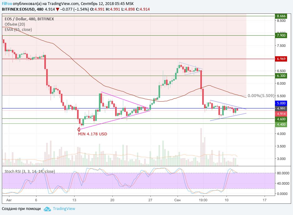 Вчера цена EOS, очередной раз протестировав нижнюю границу вымпела, восстановилась к пятидолларовому рубежу. Несмотря на прогнозы по снижению пары, цена устойчиво бьётся в сужающемся боковике. Сегодняшнее ночное снижение цены опять проходило в пределах вымпела.
