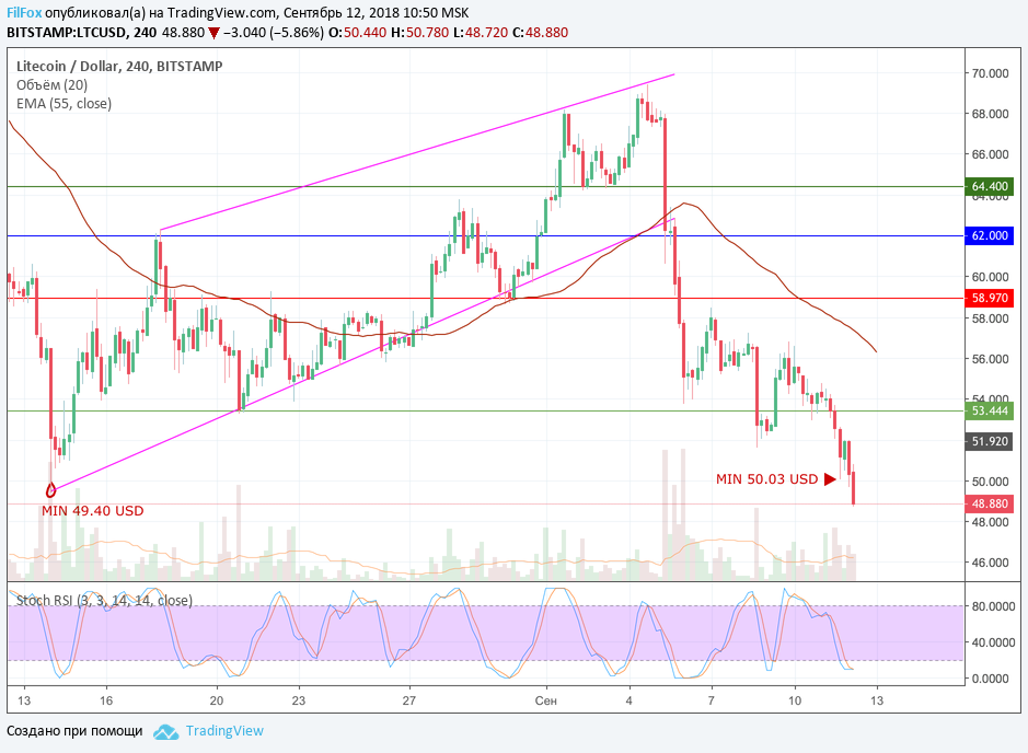 Вчера, во второй половине дня, цена Litecoin, прорвав нижнюю границу широкого бокового диапазона, которая находится на уровне 53.44 USD, достигла минимального дневного значения на отметке 50.03 USD.