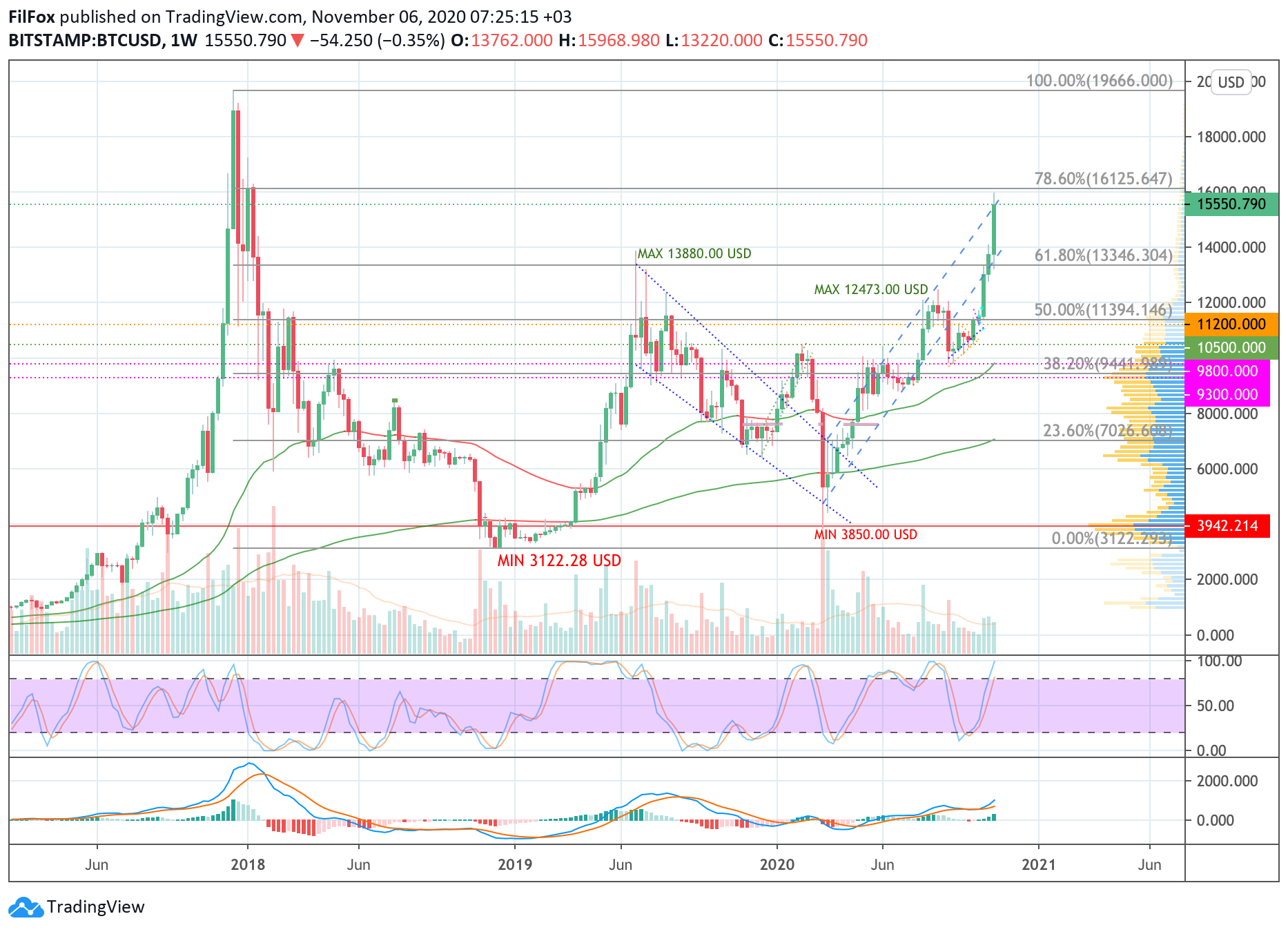 Сегодня ночью годовой максимум был установлен в районе отметки 15970.00 USD, а на утро цена откатилась к верхней границе восходящего канала. Похоже, что синяя трендовая линия окажет поддержку и рост продолжится к уровню 78.6% фибо (16125.65 USD).