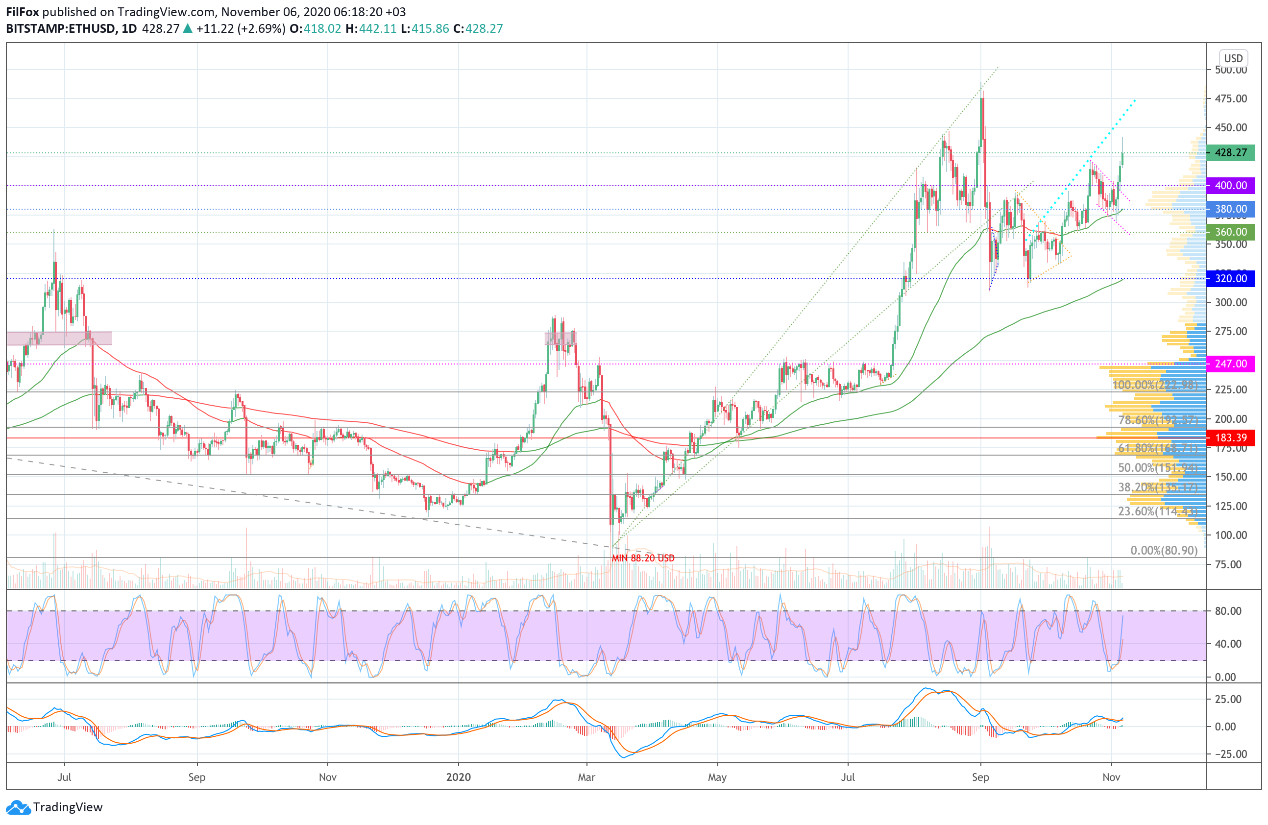 Цена Ethereum вчера поддержала бычий рост криптовалютного флагмана и пробила уровень октябрьского максимума, установив месячный рекорд цены в районе отметки 442.00 USD.