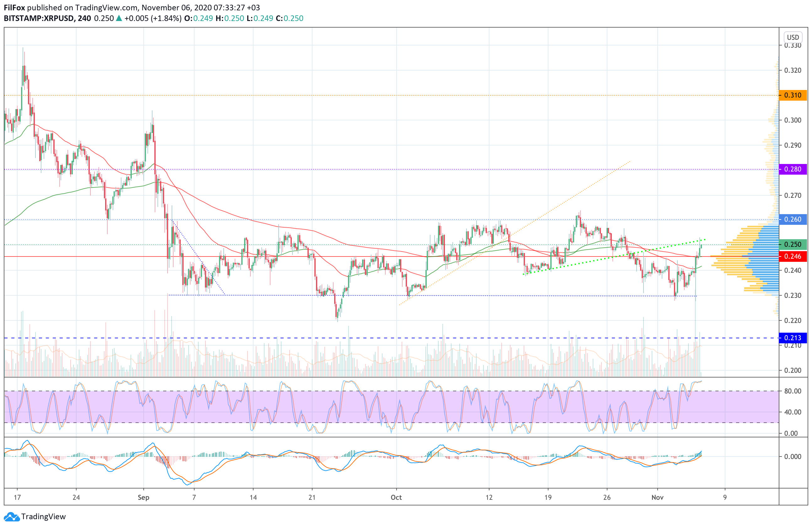 Вчера цена Ripple демонстрировала умеренный рост и сегодня ночью протестировала зелёную восходящую линию тренда. Пробить её покупатели пока не могут, но если сегодня рост цен на рынке продолжится, то пара может выйти из широкого бокового коридора $0.230 - $0.260, в котором цена находится уже более двух месяцев.