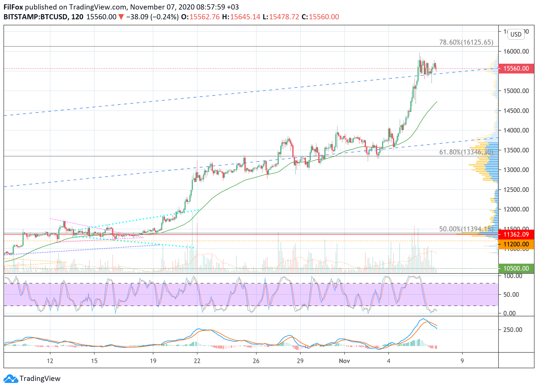До завершения дня продавцам удалось проколоть верхнюю границу синего коридора, но до утра пара удержалась выше линии тренда. Если быки смогут нарастить объёмы и продолжить рост, то они протестируют уровень 78.6% фибо (16125.65 USD).