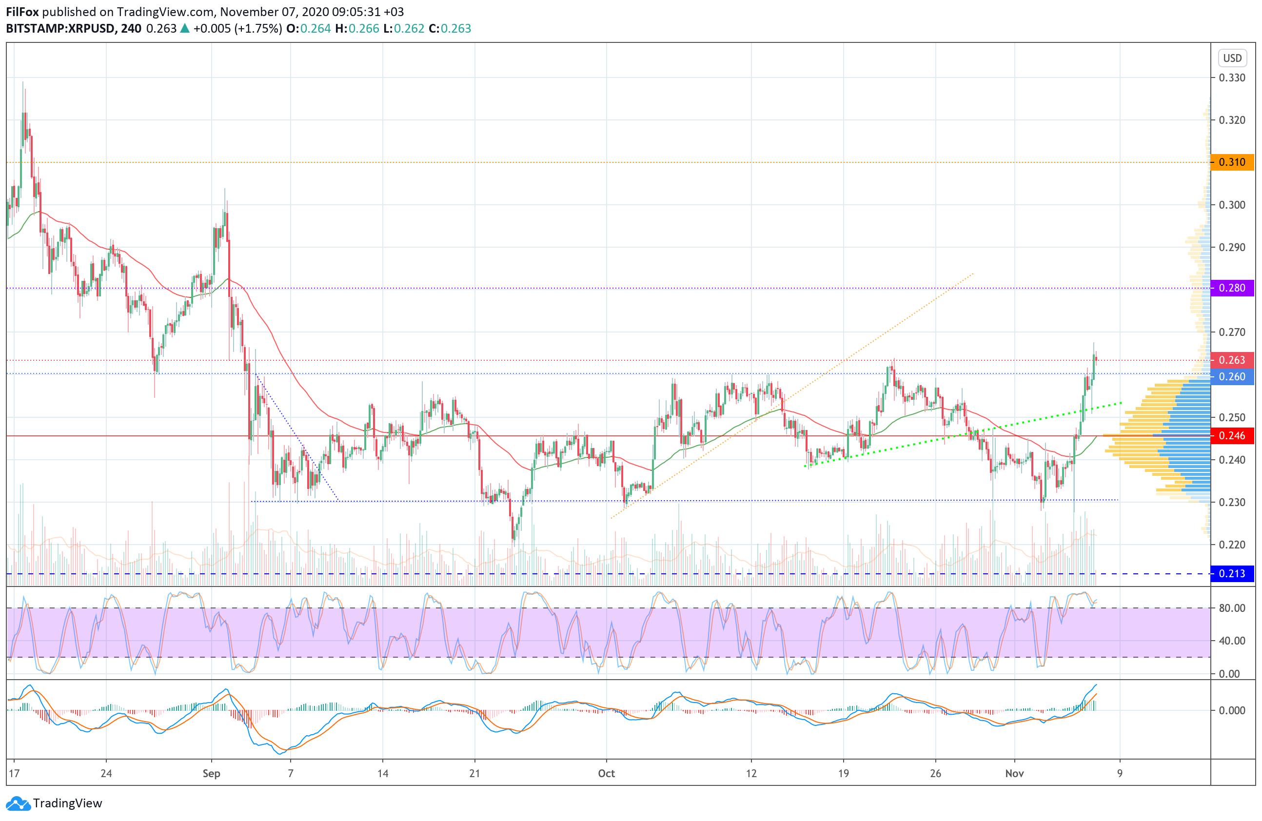 На утро цена немного откатилась, но мы полагаем, что верхняя граница бокового коридора сможет оказать цене XRP поддержку и пара продолжит рост к сопротивлению 0.280 USD.